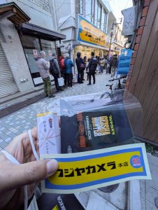 列に並びレンズをゲット ニコン羊羹でしょ キヤノンはコーヒーのようです 新年のお買い物のプレゼントでしょうか 二千円分の中野で買い物出来る券も頂きました しまうと忘れそうなので即買い物 文明堂で桐箱?五三カステラを奮発